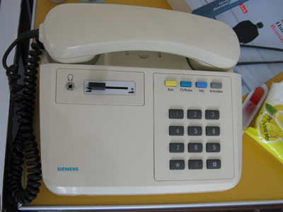 Seit ich bei dieser Firma arbeite, ist meine Arbeitsmotivation ja, wenn ich einmal in ein Krankenhaus käme, auf Gerät und Software blicken zu können, mit dem ich untersucht werde und zu wissen: Hey, das hast du selbst mitgestaltet! Ich will nicht sagen "endlich!", aber diesmal war es soweit, und ich war tatsächlich ein bisschen stolz. Um so mehr habe ich mich geschämt, als ich dieses aus einem Ingenieurshirn entbundene Fernbedienungstelefon auch in meinem Krankenzimmer entdeckte. (Und prompt auch nicht ohne Erklärung bedienen konnte. Als Informatiker!).